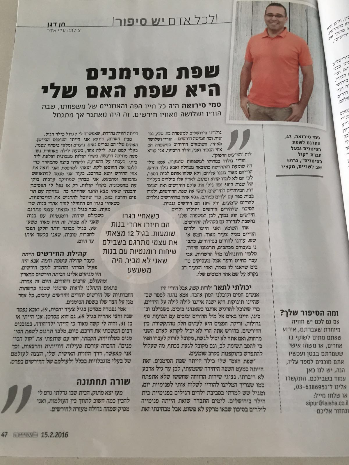 כתבה בעיתון לאישה על הסיפור המיוחד של סמי סירואה